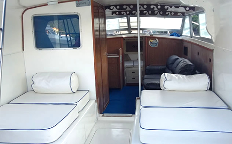 The Boat has bathroom , 2 fishing chairs, a sofa to lay down , place on the fly bridge to seat and see the sightseeing while cruising the bay of Ixtapa and Zihuatanejo .